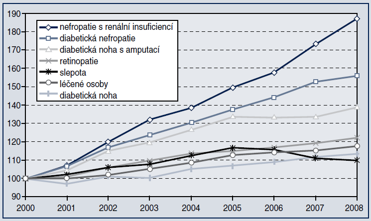 Obr. 1 Léčení diabetici a komplikace diabetu (index rok 2000 = 100 %)