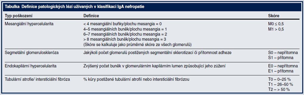 IgA nefropatie (IgAN) představuje celosvětově nejčastější primární glomerulonefritidu (GN), a tak není divu, že se jí věnuje větší pozornost než jiným GN. I přes tento fakt stále neexistuje obecná shoda ohledně patologické a klinické klasifikace tohoto onemocnění. Z literatury jsou známa data ukazující, že proteinurie, hypertenze a snížená glomerulární filtrace jsou významnými rizikovými faktory progrese onemocnění, zatímco snížení proteinurie během léčby je důležitým faktorem zpomalujícím progresi. Řada dosud používaných patologických klasifikací IgAN byla založena pouze na názorech jednotlivců, patologické nálezy nebyly korelovány s laboratorními výsledky a značně tím byla limitována možnost odhadu prognózy onemocnění. Tato nejednotná klasifikace také znemožňovala organizaci větších studií u IgAN.