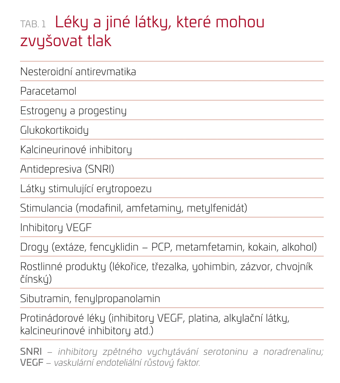 Rezistentní hypertenze je definována jako systolický tlak 140 mm Hg a/nebo diastolický tlak 90 mm Hg nebo vyšší za předpokladu, že pacient užívá trojkombinaci zahrnující inhibitor angiotenzin konvertujícího enzymu (ACEI)/sartan + blokátor kalciových kanálů + thiazidové nebo thiazidům podobné diuretikum, krevní tlak (TK) byl potvrzen ambulantním monitorováním a byla vyloučena pseudorezistentní hypertenze (zejména nedodržování léčby) a sekundární hypertenze, včetně užívání látek, které mohou TK zvyšovat (tab. 1). Kličková diuretika jsou doporučena až při poklesu glomerulární filtrace pod 30 ml/min/1,73 m2 (0,5 ml/s/1,73 m2), kombinace s chlortalidonem je možná i pod touto hranicí. Jako čtvrtá látka do kombinace se doporučuje spironolakton, ale lze užít i kteroukoliv další třídu antihypertenziv.