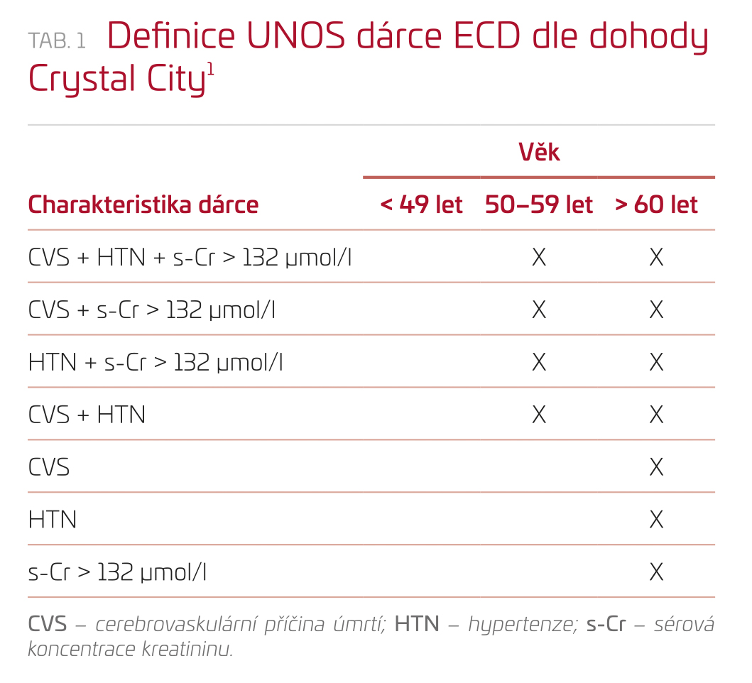 Při setrvale se zvyšujícím počtu čekatelů na orgánovou transplantaci je logická snaha o využívání orgánů, které se svou charakteristikou více či méně vzdalují od zmiňovaného ideálu. V nomenklatuře je využívána řada pojmů, které se svým významem překrývají: Marginální dárce je obecný a široký termín poukazující na suboptimalitu odebraného orgánu. V podstatě neexistuje jeho jednoznačná definice a kritériem hodnocení může bý nejen věk, ale i další komorbidity dárce (akutní orgánové poškození, protrahovaná studená ischemie, onemocnění s rizikem přenosu od dárce na příjemce, malignita, civilizační choroby atd.) či proběhlý předodběrový inzult. Marginalita je blíže specifikována v termínu „dárce s rozšířenými kritérii“, který prvně použil Kaufmann v roce 1997. Ten zrazuje od poněkud pejorativního pojmu „marginální“. Exaktnější definice byla poskytnuta dalšími pracemi. Jednoznačnou definici poskytla analýza United Network for Organ Sharing data (UNOS), která vznikla z jednání v Crystal City (tab. 1) a zavádí pojem dárce ECD (expanded criteria donor). Vychází z analýzy dárcovských charakteristik spojených s vyšším relativním rizikem (1,7×) selhání transplantované ledviny.