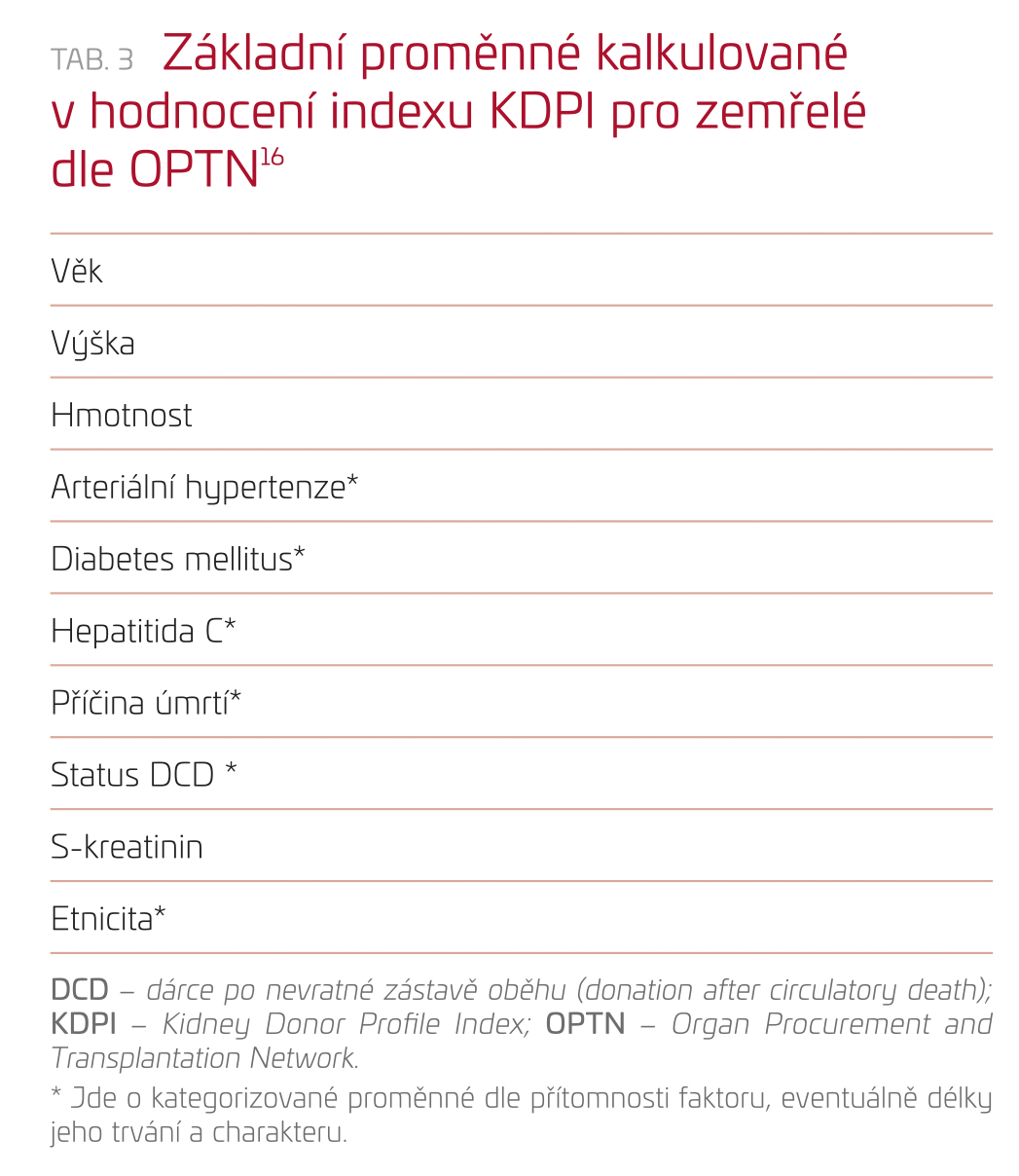 S postupným růstem zkušeností se rozvíjela snaha o kvantitativní vyjádření dárcovských charakteristik spíše než dichotomické rozdělení užívané předchozí definicí z Crystal City. Dichotomické rozdělení dle těchto kritérií zařazuje jako ECD jakéhokoliv dárce staršího 60 let, jakkoliv může být dopad změn souvisejících se stárnutím ledvin na jejich funkci i ultrastrukturu značně heterogenní. Lze připustit, že ve skupině hodnocené jako SCD může za jistých okolností docházet k podhodnocení míry rizika budoucího selhání štěpu, a naopak u „zdravých“ dárců ECD může být toto riziko nadhodnocováno. Jako možné řešení tohoto problému byl ve Spojených státech vyvinut Kidney Donor Risk Index (KDRI). Index KDRI je kalkulován z 10 faktorů dárce (tab. 3) a udává v podstatě relativní riziko selhání štěpu ledviny po transplantaci od konkrétního zemřelého dárce ve srovnání s mediánem dárců (hodnoty 0,5–3,5).10 Kidney Donor Profile Index (KDPI) ukazuje percentil KDRI ve srovnání s předchozím rokem. Například dárce s KDPI 80 má index KDRI vyšší než 80 % dárců v předchozím roce. Výhodou je numerické vyjádření kvality štěpu, které řeší předchozí variabilitu kvality uvnitř skupiny SCD/ECD. Nadále však tento model nezahrnuje rizika vyplývající z akutního či periprocedurálního poškození ledvin či anatomických abnormalit.