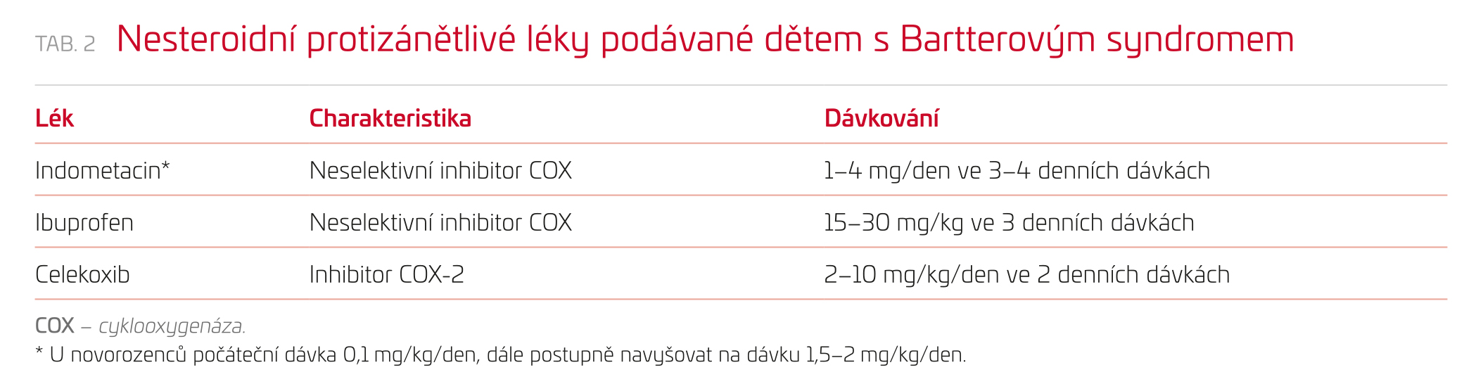 Terapie je započata bez znalosti výsledku genetického vyšetření s cílem předejít rozvratu vnitřního prostředí.12 Recentně byla publikována nová doporučení pro léčbu BS i GS u dětí.6,16 Základem léčby BS je úprava diety a substituce elektrolytů, kterou je vhodné rozdělit alespoň do tří denních dávek (ideálně více dle tolerance pacienta) vzhledem ke kontinuálním ztrátám iontů a vody do moči. Hypokalemie je závažným projevem BS, významný pokles koncentrace kalia v séru může pacienta ohrozit hlavně fatálními arytmiemi.9 Kalium obvykle hradíme ve formě chloridu draselného (KCl) s cílem dosáhnout koncentrace kalia v séru alespoň 3 mmol/l. KCl nepodáváme nalačno, abychom dosáhli lepší tolerance. Jiné sloučeniny kalia, jako je např. citrát, nejsou k substituci vhodné vzhledem k možnému zhoršení alkalózy. V případě hypomagnezemie podáváme soli hořčíku, aspartát, citrát a laktát mají lepší biologickou dostupnost v porovnání s anorganickými sloučeninami (oxid, hydroxid).25 Cílová koncentrace magnezia v séru je > 0,6 mmol/l. V léčbě se dále užívají nesteroidní protizánětlivé léky, inhibitory cyklooxygenázy (COX), které snižují produkci prostaglandinů, zmírňují symptomy a příznivě ovlivňují iontogram, glomerulární filtraci i růst dětí s BS. V současnosti nemáme dostatek dat k určení inhibitoru COX první volby. V případě jejich podávání je nutno vzít v potaz možný rozvoj gastrointestinálních nežádoucích účinků, při podávání neselektivních inhibitorů COX se doporučuje současné užívání inhibitorů protonové pumpy s vědomím rizika vzniku hypomagnezemie. Terapii inhibitory COX nasazujeme u euvolemických pacientů s vědomím rizika možné nefrotoxicity. Seznam inhibitorů COX užívaných v léčbě BS shrnuje tabulka 2. V současnosti není pacientům s BS podávání kalium šetřících diuretik, thiazidů a léků inhibujících osu RAA obecně doporučováno vzhledem k riziku vzniku hypovolemie a potenciace solných ztrát. Jejich případné nasazení je namístě u jedinců s vážnými iontovými abnormalitami, které přetrvávají při maximální intenzitě léčby substitucí kalia a nesteroidními protizánětlivými léky.6 U některých pacientů s BS a růstovým neprospíváním lze při nedostatečné produkci růstového hormonu zvážit zahájení léčby růstovým hormonem, ale to až po adekvátní metabolické kompenzaci základního onemocnění výše zmíněnou konzervativní léčbou.26