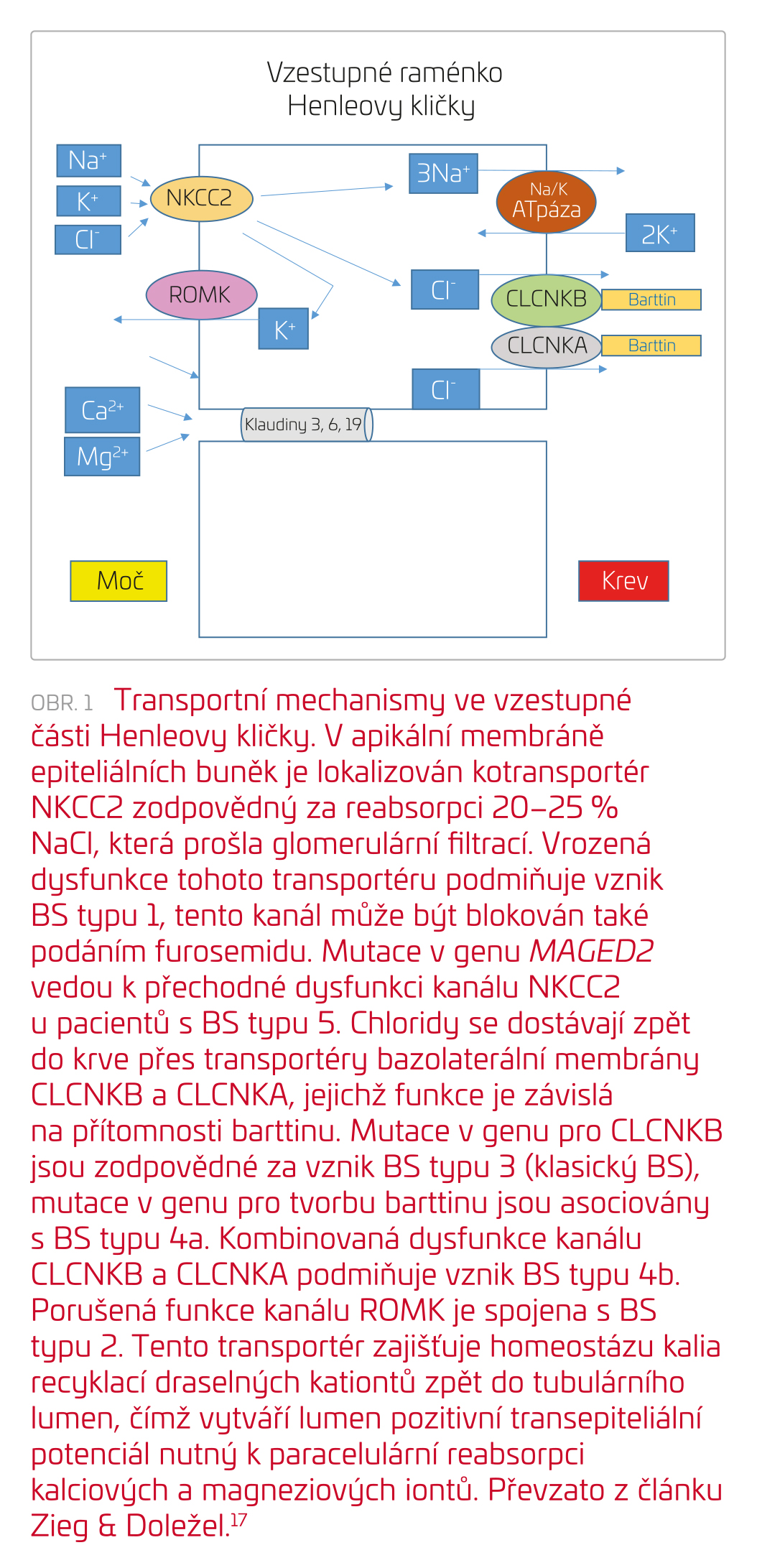 Bartterův syndrom (BS) představuje skupinu onemocnění charakterizovanou polyurií, hypokalemií, metabolickou alkalózou, hyperreninovým hyperaldosteronismem a normotenzí. V současné době rozeznáváme pět typů Bartterova syndromu v závislosti na genovém defektu. Na toto onemocnění často pomýšlíme již v prenatálním období, neboť u většiny matek bývá přítomen polyhydramnion. Pro jedince s BS je dále typické růstové neprospívání, u některých typů BS diagnostikujeme hyperkalciurii a nefrokalcinózu (tab. 1). Základním patofyziologickým mechanismem BS je porucha funkce tlusté části vzestupného raménka Henleovy kličky, která představuje zásadní komponentu mechanismu koncentrační schopnosti nefronu i transportu elektrolytů.4 Následkem porušené funkce této části nefronu dochází k rozvoji polyurie, dehydratace a ke vzniku polyhdramnionu. Solné ztráty vedou k aktivaci osy renin‑angiotenzin‑aldosteron (RAA) s následným zvýšeným vylučováním kalia a chloridů, v laboratoři nacházíme známky hypochloremické metabolické alkalózy s hypokalemií. Zároveň dochází k porušení mechanismu tubuloglomerulárního feedbacku s aktivací cyklooxygenázy 2, macula densa detekuje sníženou koncentraci chloridových iontů v tubulárním filtrátu, následkem čehož dochází k produkci velkého množství prostaglandinů, jež také stimulují produkci reninu a aktivují osu RAA s cílem udržet intravaskulární objem.5 Porucha reabsorpce solí ve vzestupném raménku Henleovy kličky má za následek sníženou resorpci kalcia vedoucí k hyperkalciurii a progresivní medulární nefrokalcinóze, a dále k narušení osmotického gradientu ve dřeni ledvin, a tím k poruše koncentrační schopnosti ledvin. Elektrolytový transport ve vzestupném raménku Henleovy kličky znázorňuje obrázek 1. Přenos onemocnění je autozomálně recesivní, pouze BS typ 5 se přenáší gonozomálně recesivně (tab. 1).6,7