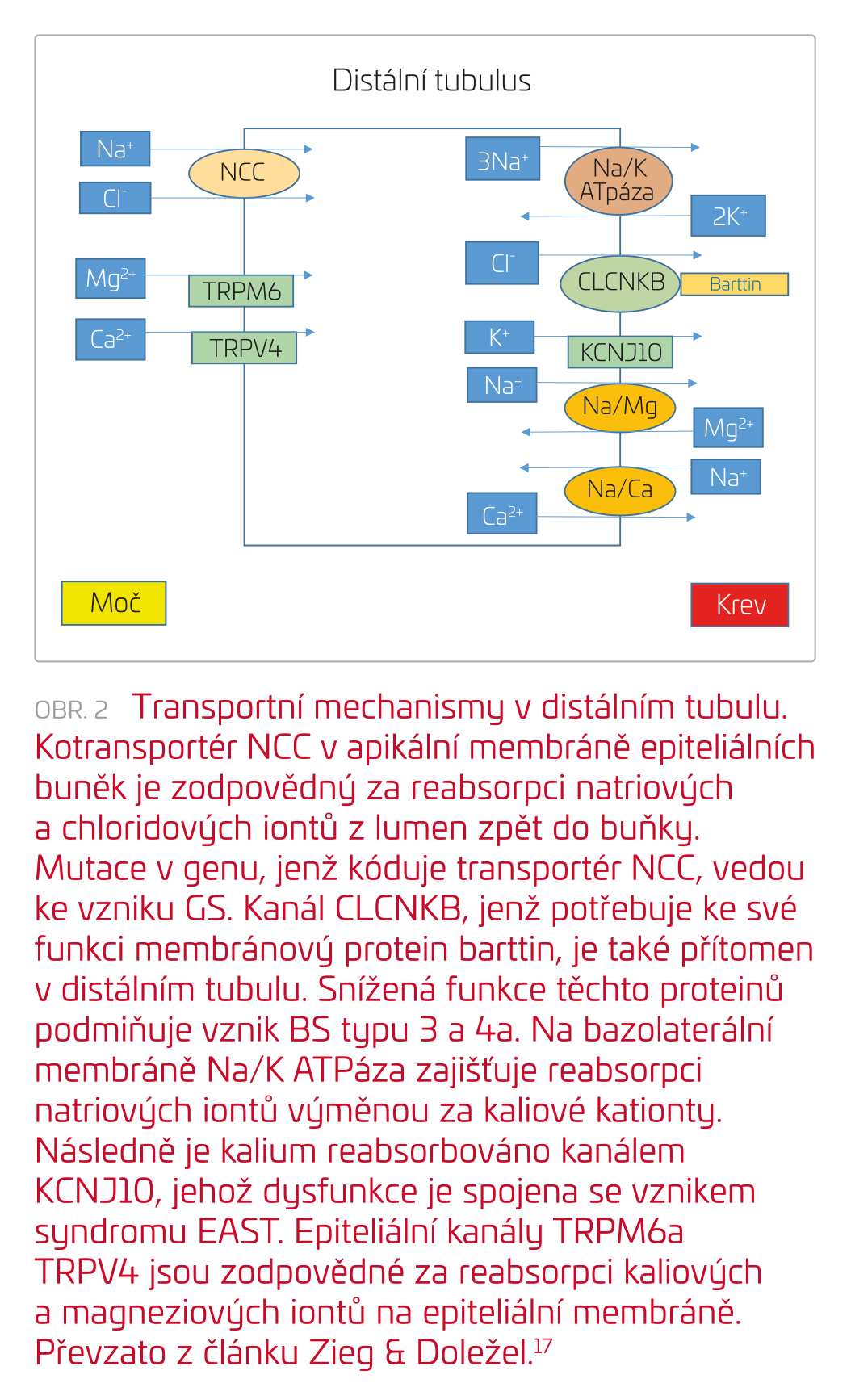 Gitelmanův syndrom (GS) je podmíněn solnými ztrátami spojenými s poruchou funkce thiazid‑senzitivního symportéru NaCl v apikální membráně distálního tubulu, tento kanál je kódován genem SLC12A3.13 Transportní mechanismy v distálním tubulu znázorňuje obrázek 2. Mezi hlavní projevy GS patří také hypokalemie, metabolická alkalóza jako důsledek aktivace osy RAA, typický je však nález hypomagnezemie a hypokalciurie. Taktéž pacienti s GS jsou normotenzní.14 Hypomagnezemie je způsobena zvýšenými ztrátami hořčíku do moči na podkladě snížené exprese luminálního kanálu TRPM6 v distálním tubulu, hypokalciurie vzniká následkem zvýšené pasivní reabsorpce kalciových iontů v proximálním tubulu.7 Fenotyp GS může být přítomen i u pacientů s BS typu 3. GS se obvykle projevuje v adolescenci či dospělosti, ale byly popsány i případy manifestace v neonatálním období.15 Mezi hlavní příznaky patří chuť na slané potraviny, polydipsie, nykturie, svalová slabost, únava, fyzická nevýkonnost, tetanie, parestezie, palpitace a hypotenze. U dětí je často patrné opoždění růstu a puberty.16