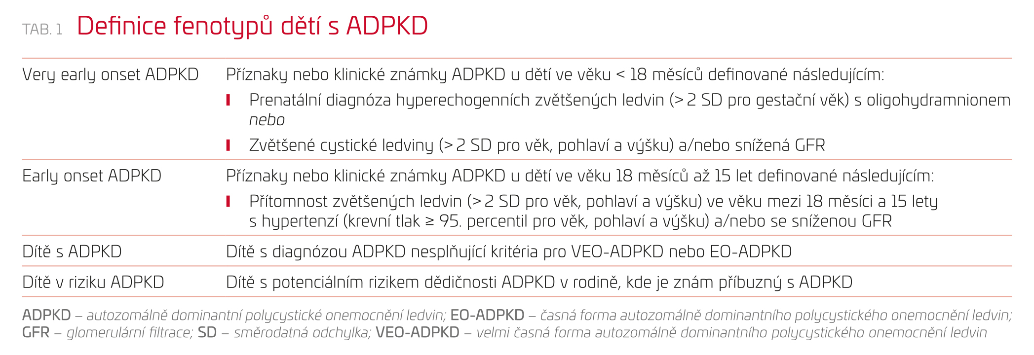 Autozomálně dominantní polycystické onemocnění ledvin (ADPKD) je nejčastějším dědičným onemocněním ledvin s prevalencí 1 : 1 000. Přestože k rozvoji selhání ledvin u pacientů s ADPKD obvykle dochází až v dospělosti, cystické změny ledvin mohou být přítomny již v dětství, a dokonce i v prenatálním období. Včasná diagnostika je proto důležitá, zejména s ohledem na léčbu komplikací onemocnění. Autoři předkládají shrnutí recentních doporučení Kidney Disease: Improving Global Outcomes (KDIGO) pro diagnostiku a léčbu dětí s ADPKD a navrhují praktický přístup k péči o tyto pacienty. Jednotlivé postupy se liší podle věku manifestace onemocnění, přičemž věkově vázané podtypy ADPKD shrnuje tabulka 1.